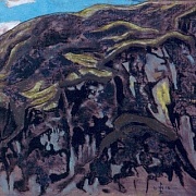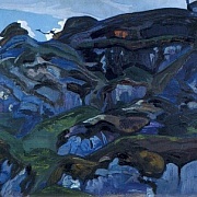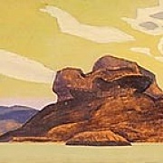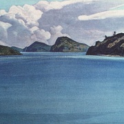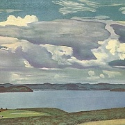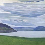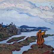 стров ВалаамКартина "Святой остров" была написана в 1917 году. На ней крупным планом изображен остров и подплывающая к нему лодка с двумя святыми старцами. Можно предположить, что художник изобразил основателей Валаамского монастыря - святых Сергия и Германа. И сюжет этот не случаен, так как теперь имеются подтверждения финской легенды о том, что пришедшие на Валаам монахи первоначально жили на соседнем острове, так как сам остров Валаам занимали местные жители. А именно - в 1991 году, в отделе рукописей Государственной библиотеки им. Ленина, московская исследовательница Наталия Охотина обнаружила рукопись ХУ1 века, в которой повествуется об изначальном выборе монахами именно святого острова, а уже затем Валаама.