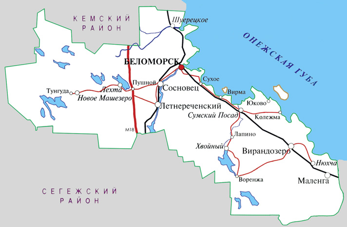 Значительный природный и культурно-исторический потенциал района дополняется выгодами его географического положения и транспортной доступности. Располагаясь в средне-восточной части Карелии, примыкающей к берегам Онежской губы Белого моря, район легко доступен с любого направления и практически всеми видами транспорта. В меридианальном направлении его пересекают железная и автомобильная дороги федерального значения. Параллельно им с юга район пересекает Беломорско-Балтийский канал, соединяющий единым водным путем три жемчужины туризма на Севере России - Валаам, Кижи и Соловки. С юго-востока в район ведет железная дорога со стороны Архангельской области, а с востока район открыт для любых морских судов благодаря расположенному в Беломорске крупному морскому порту. Особое значение приобретает доступность района со стороны скандинавских стран, связь с которыми обеспечивается автомобильным транспортом через ТПП "Люття" по дороге Костомукша - Ледмозеро - Кочкома.